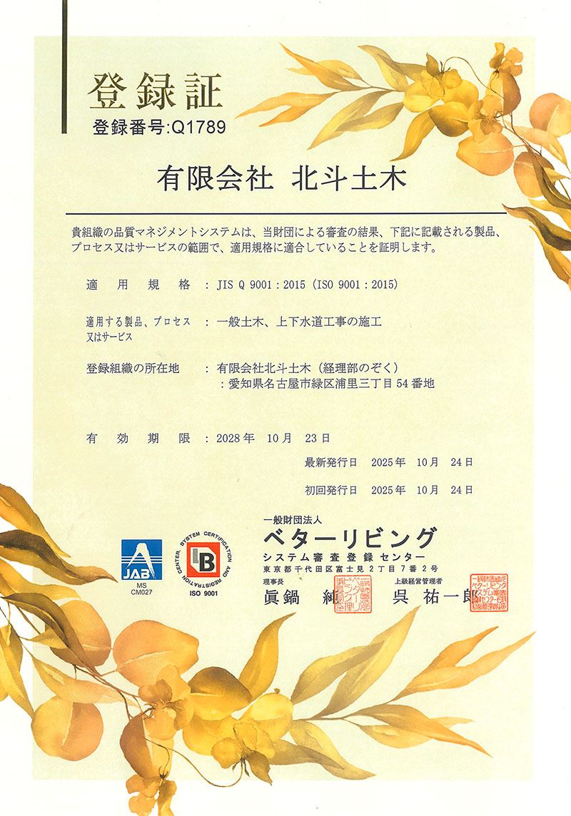 ISO 9001を取得いたしました 投稿日: 2025年11月10日 投稿者: hokutodoboku 一般土木、上下水道工事の施工において、ISO9001規格を取得致しました。 今後も更なる弊社サービスの品質向上、顧客満足の向上を目指して取り組んでまいります。